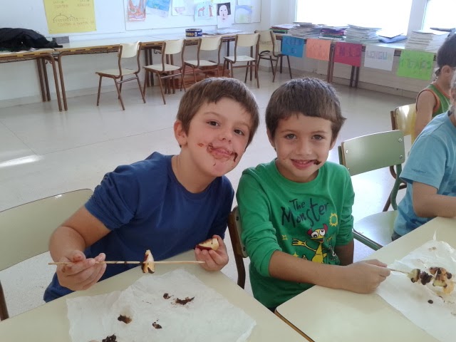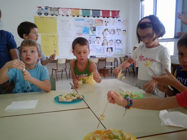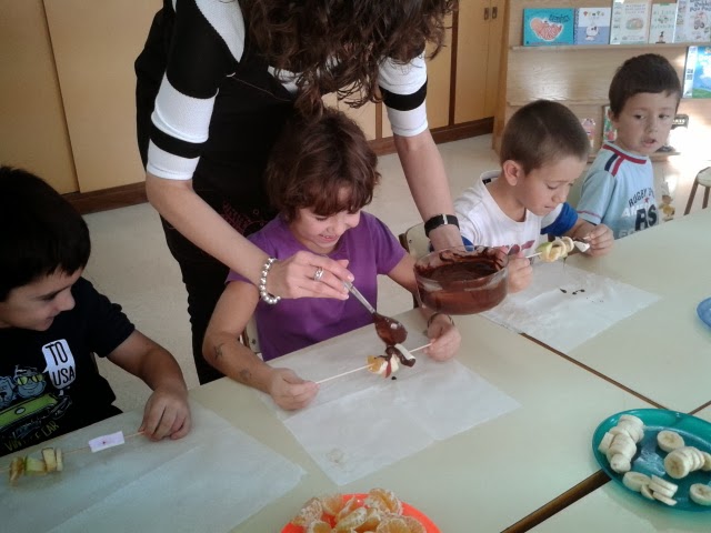 El pasado miércoles 16 de octubre fue el cumpleaños de la tutora de primer curso de primaria, Mª Ángeles. Para celebrarlo, los niños de su clase prepararon su propio almuerzo: brochetas de fruta… ¡¡CON CHOCOLATE!!